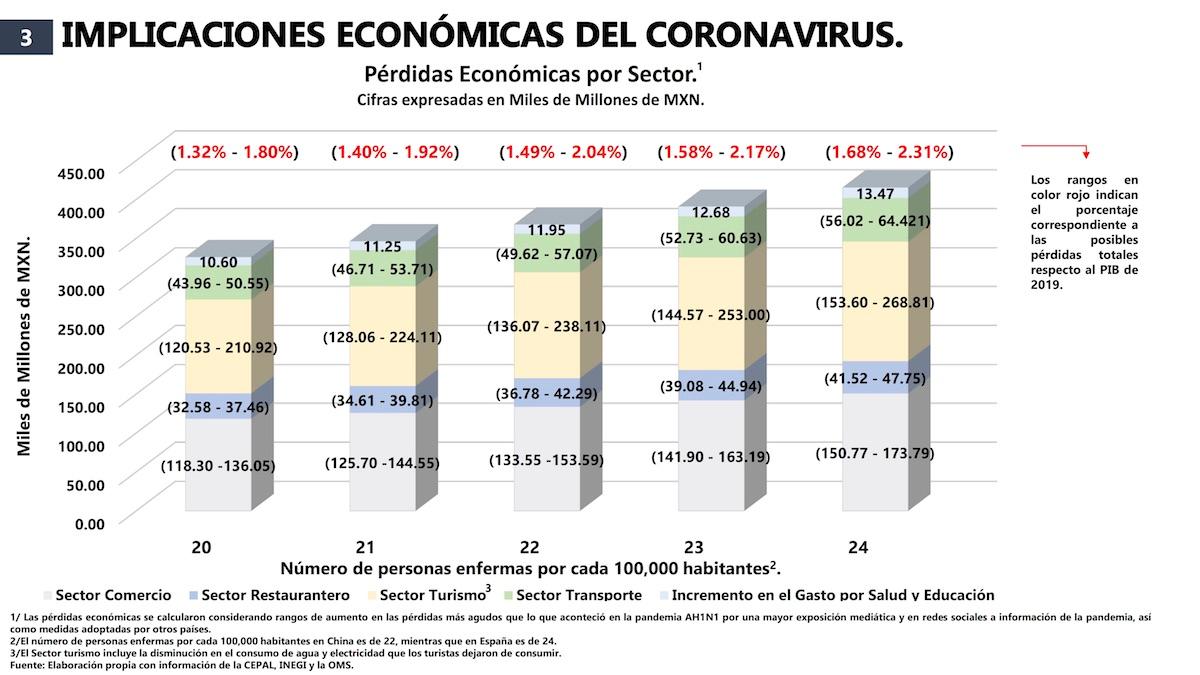 El estudio anota que el calculo por las pérdidas económicas se hizo “considerando rangos de aumento en las pérdidas más agudos que lo que aconteció en la pandemia AH1N1 por una mayor exposición mediática y en redes sociales a información de la pandemia, así como medidas adoptadas por otros países”.