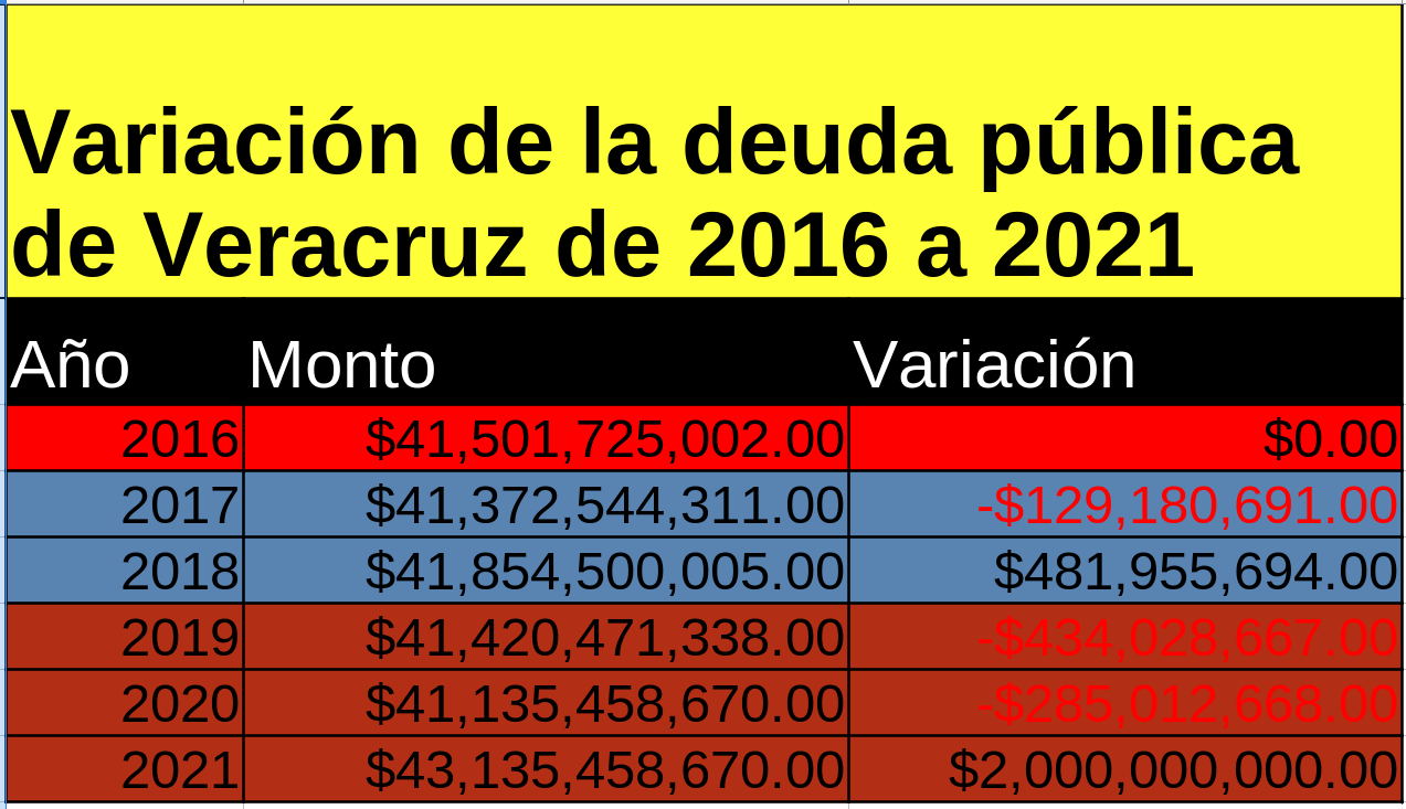 Si a esta cifra se le suman los 2 mil millones de pesos que se están pidiendo, la deuda pública de Veracruz se podría ubicar en 44 mil 975 millones de pesos, casi 45 mil millones.