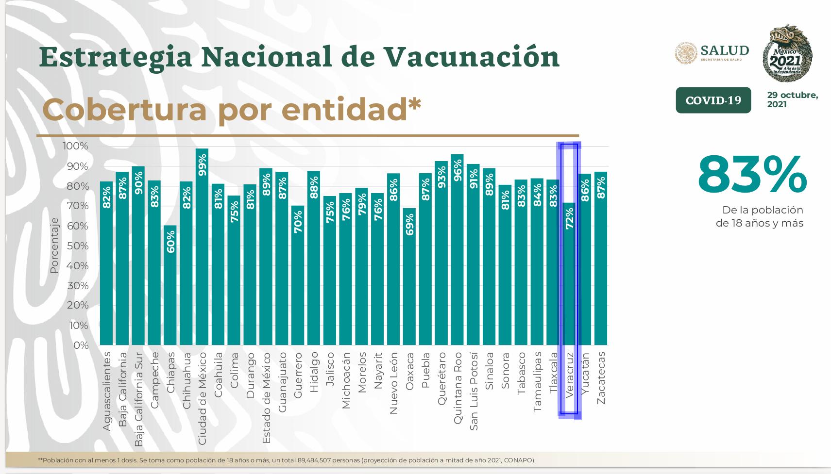 El cuarto peor índice de vacunación, con 72%; los otros tres peores fueron Oaxaca, con el 69%, Guerrero, con el 72% y Chiapas, con el 60% de su población mayor de edad vacunada.