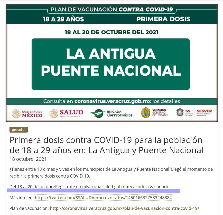 Ahí está en la página de Sesver y lo pueden ver si es que todavía no lo quitan (https://www.ssaver.gob.mx/blog/2021/10/18/primera-dosis-contra-covid-19-para-la-poblacion-de-18-a-29-anos-en-la-antigua-y-puente-nacional-2/ ).