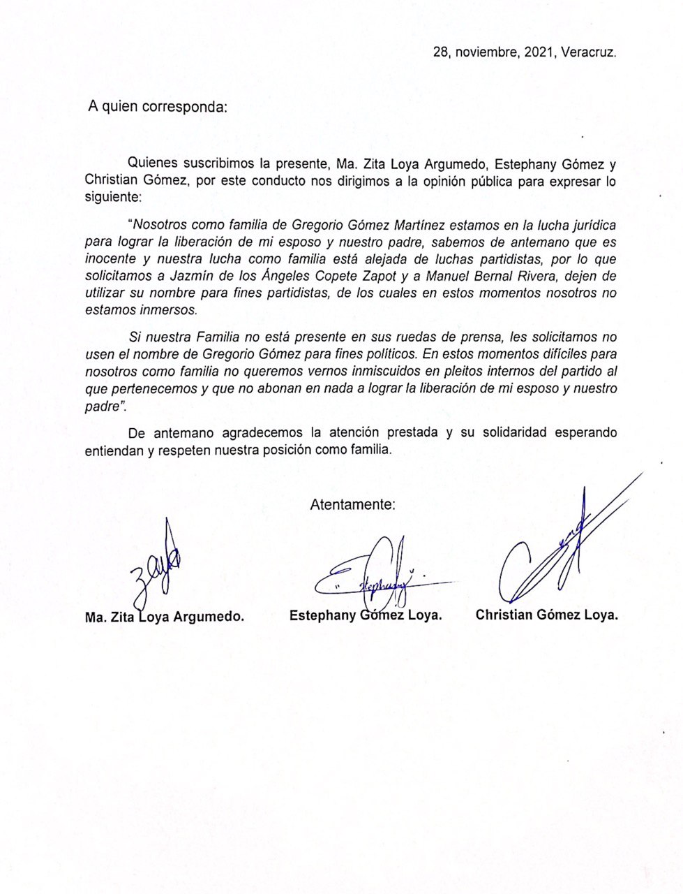 Mediante una carta firmada –misma que anexamos fotografía- por la esposa e hijas de Gregorio Gómez, se hace la extensa suplica a Manuel Bernal Rivera y a Yazmín de los Ángeles Copete Zapot, no emplear el nombre del hoy detenido por así convenirle a sus intereses jurídicos.