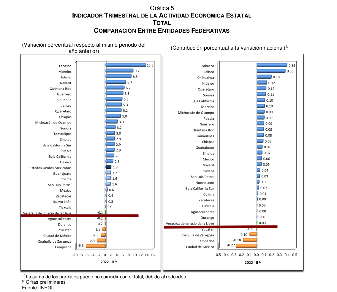 El Indicador Trimestral de la Actividad Económica Estatal (ITAEE), que desarrolla el INEGI, muestra que en el segundo trimestre de 2022, la actividad económica de Veracruz registró descenso anual de -0.1 por ciento.