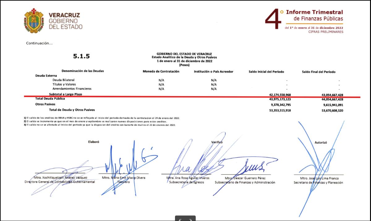 Esto de acuerdo con el documento firmado por el titular de la Sefiplan, Lima Franco, que es quien firma los informes trimetrales de las finanzas públicas de Veracruz en el actual gobierno.