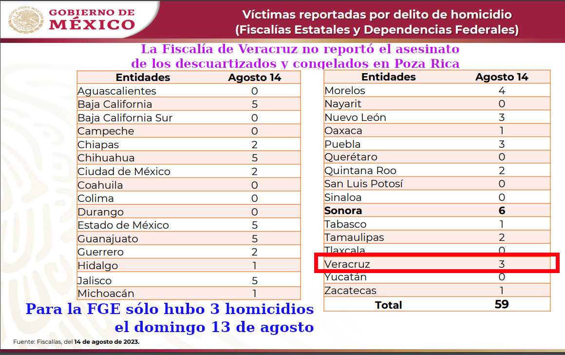 Así, la dependencia federal informó que “nada más” hubo 59 asesinatos en todo el país el 13 de agosto, reportados por las fiscalías.