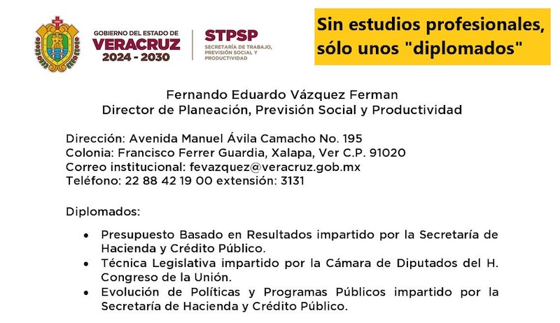 Vaya a Vázquez Ferman lo hicieron director de Planeación, Previsión Social y Productividad de la Secretaría del Trabajo de Veracruz, aún cuando carece de estudios profesionales.