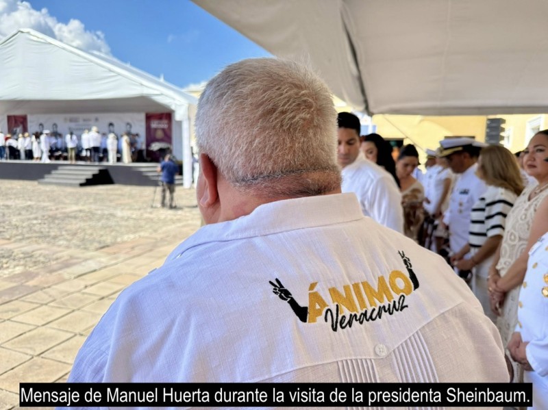 Durante la visita de la presidenta Claudia Sheinbaum al puerto de Veracruz, el senador de Morena, Manuel Huerta, realizó lo que se puede considerar una protesta silenciosa y a la vez un llamado a los veracruzanos a no caer en el desánimo por las condiciones que prevalecen en el estado y luego del crimen de Juan Carlos Mezhua Campos, activista social y político de la Sierra de Zongolica, pues vistió una guayabera blanca con la leyenda muy visible en la espalda “Ánimo Veracruz” en letras color oro y negro y con dos brazos en alto a los lados con los puños de las manos cerradas y dos dedos haciendo la V de la victoria.