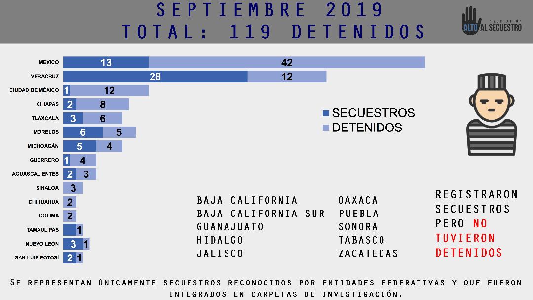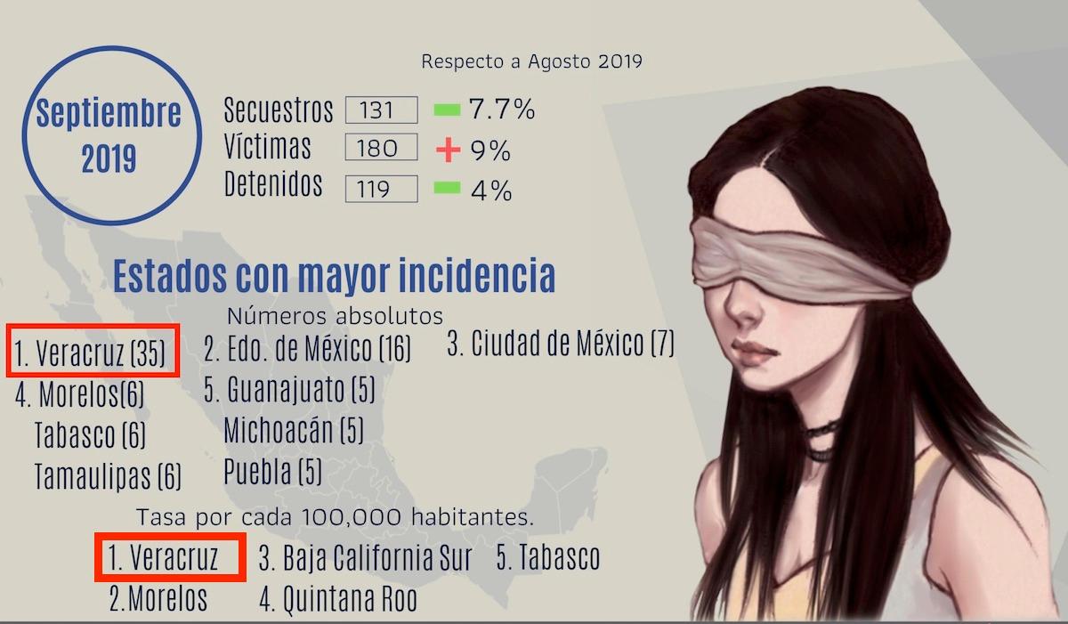 Veracruz es hoy el estado que más secuestros acumuló durante septiembre, es el que tiene el mayor número registrado durante el sexenio de diciembre del 2018 a septiembre del 2019; es el estado con mayor tasa de incidencia por cada 100 mil habitantes.