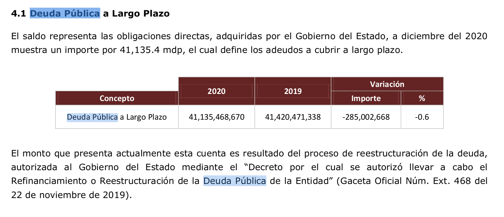En el cuadro “Reducción del Saldo de la Deuda Pública del Estado con relación a lo registrado al 31 de diciembre de 2020”, incluido en las páginas 71 y 72 del “4to Informe Trimestral de Finanzas Públicas” 2020 del gobierno de Veracruz, se anota que la deuda pública del gobierno del estado al 31 de diciembre de 2020 era de 42 mil 975 millones de pesos, por un crédito adquirido en diciembre de 1 mil 840 millones de pesos, el cual todavía no se paga.