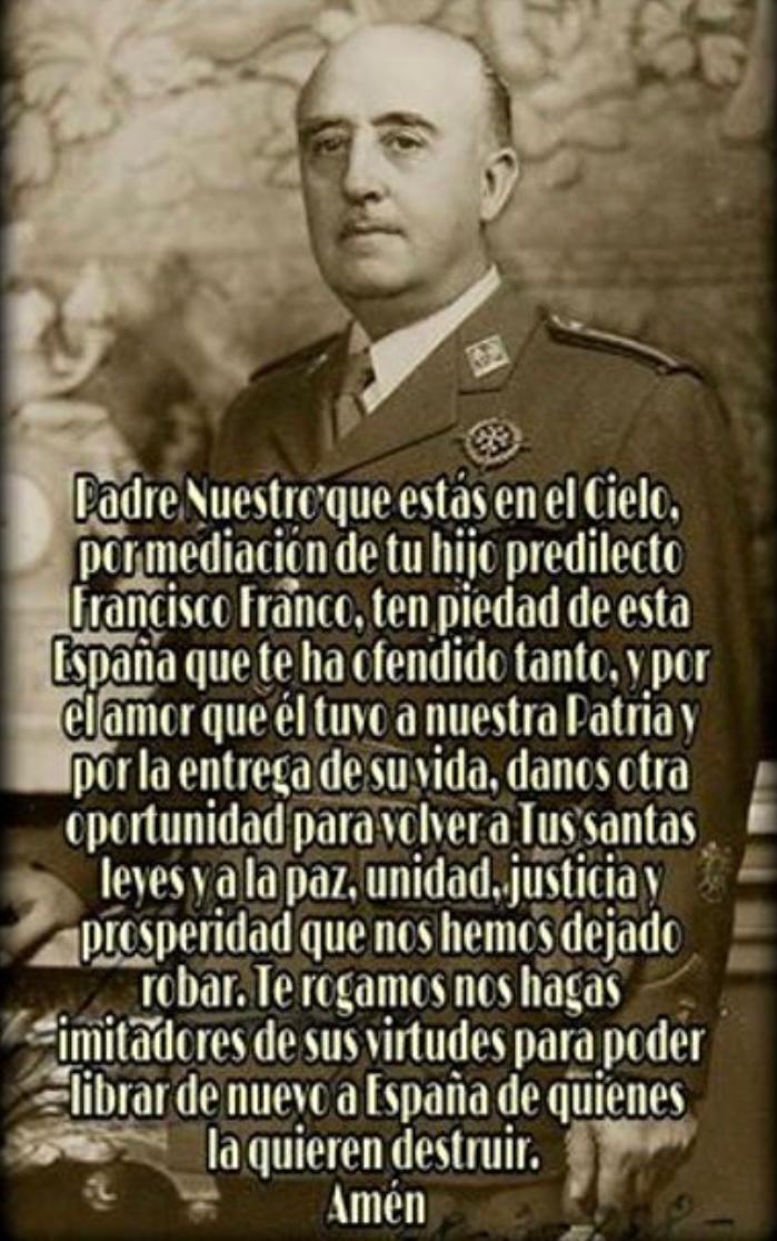 ‘Padre Nuestro que estás en el Cielo, por mediación de tu hijo predilecto Francisco Franco, ten piedad de esta España que te ha ofendido tanto, y por el amor que él tuvo a nuestra Patria y por la entrega de su vida, danos otra oportunidad para volver a Tus santas leyes y a la paz, unidad, justicia y prosperidad que nos hemos dejado robar. Te rogamos nos hagas imitadores de sus virtudes para poder librar de nuevo a España de quienes la quieren destruir. Amén’