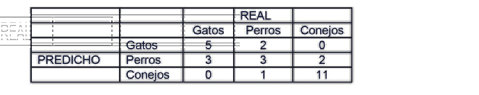 ‘En la matriz ejemplo que aparece seguidamente, de 8 gatos reales, el sistema ha predicho que tres eran perros y de los 6 perros ha predicho que 1 era un conejo y 2 eran gatos. A partir de la matriz se puede ver que el sistema tiene problemas para distinguir entre perros y gatos, pero que puede distinguir razonablemente bien entre conejos y otros animales: