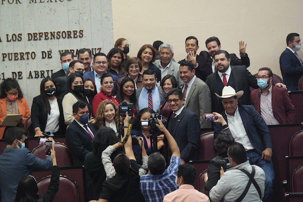 En la siguiente hilera, en el mismo orden, dos chapitos: Nora Jessica Lagunes Jáuregui y Bingen Rementería. De colado, Enrique Cambranis, quien quizás por haber ocupado esa misma curul en la anterior Legislatura, ya no se quiso mover de allí.