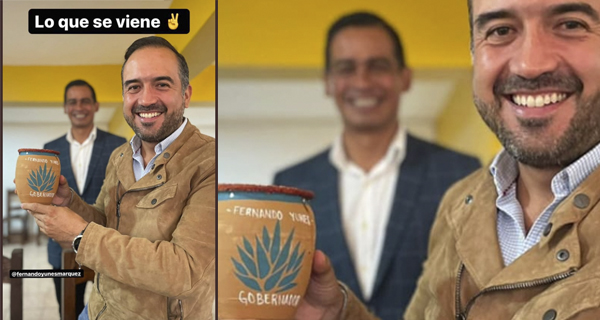 Una fotografía circuló ayer por redes. Se ve a Fernando Yunes Márquez sosteniendo un cantarito con la leyenda: “Fernando Yunes. Gobernador” encabezada con un “Lo que se viene” con una mano en señal de Victoria.
