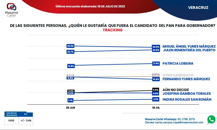 La panista que aparece en las encuestas de Massive Caller es Patricia Lobeira, actual presidente municipal del Puerto jarocho… las preferencias son la mitad de lo que trae Julen, pero podría aplicarse el mismo tenor que se le dio a Chiquinando… ella tiene seis meses en el balcón político… y puede seguir creciendo, incluso ¡más que el propio cuñao!