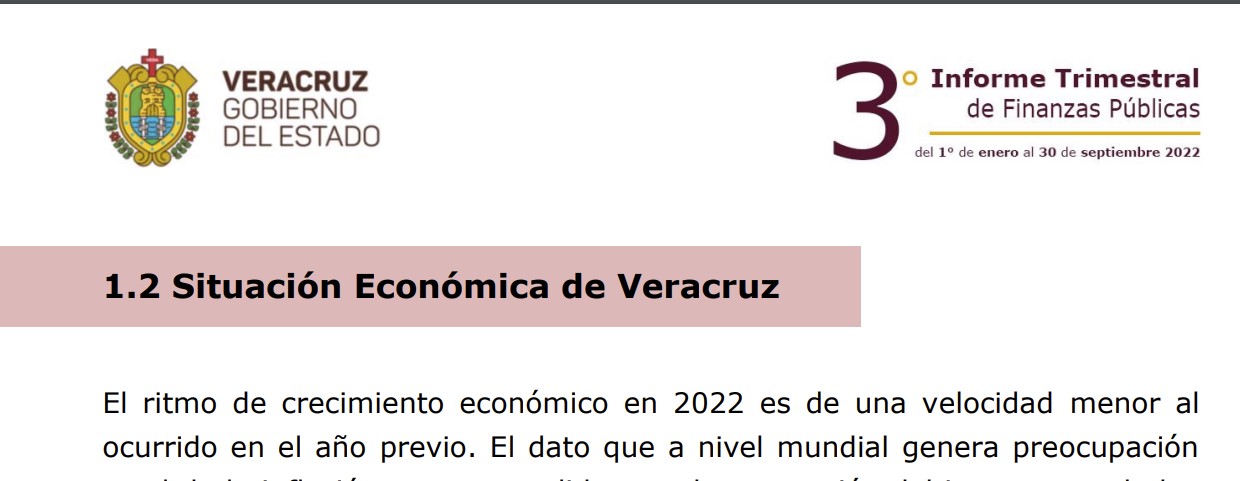 En el Tercer Informe Trimestral de Finanzas Públicas del 2022, del gobierno de Cuitláhuac García, en el apartado “Situación Económica de Veracruz” se reconoce de inmediato que “el ritmo de crecimiento económico en 2022 es de una velocidad menor al ocurrido en el año previo”.