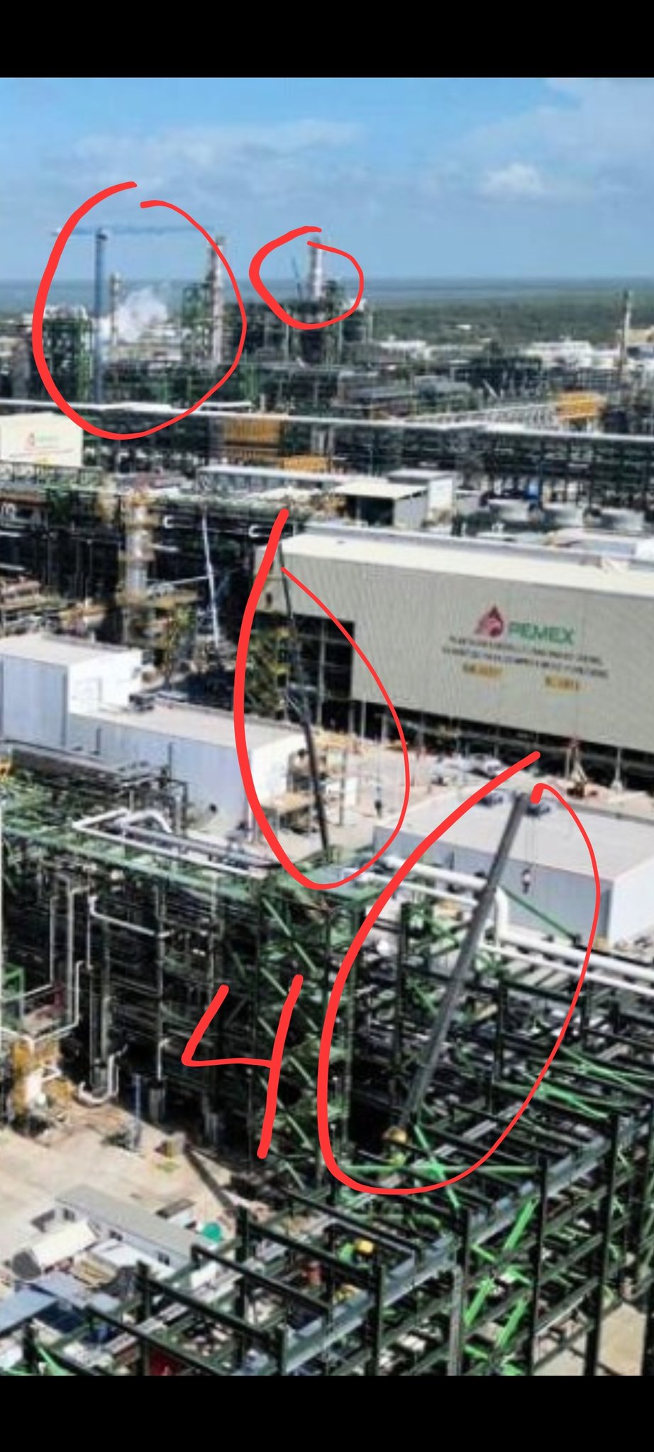 “Las fotografías que siguen poniendo de la @Refineria2Bocas son preciosas para ver el detalle de qué siguen construyendo. Donde puse el número 4 es una grúa para COLOCAR tubería. Again, si no han acabado construcción NO hay pruebas que realizar”.