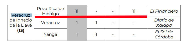 En ese concentrado la mención es de 11 asesinatos en Poza Rica, según anotan que fue información tomada de una nota publicada en El Financiero.