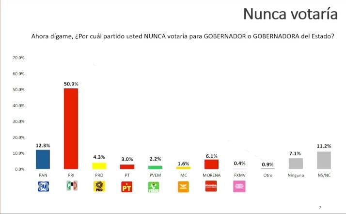 En las tres encuestas en el apartado de “por cuál partido nunca votarías”, es el Revolucionario Institucional el que se lleva toda la negatividad de los entrevistados…. Más del 50 por ciento está en contra del otrora Partidazo.