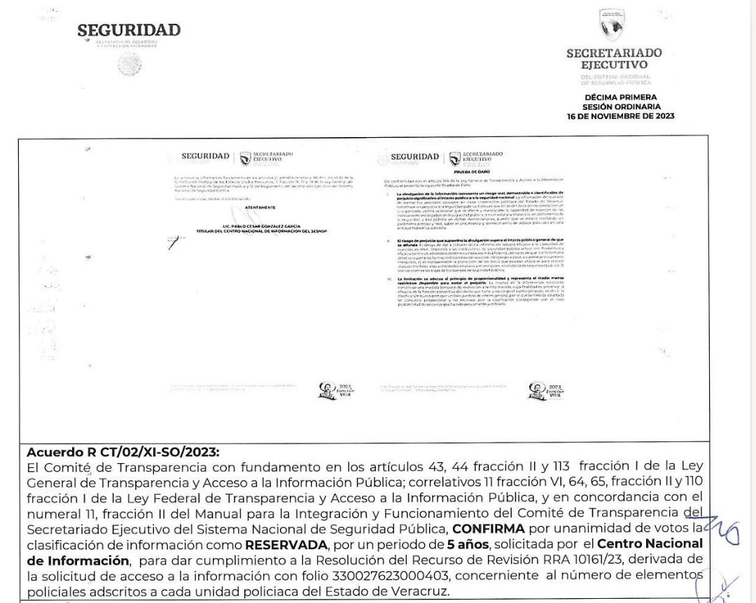 “Asimismo, la difusión del número de efectivos con que disponen las instituciones policíacas del Estado de Veracruz, refleja parte de la estrategia para fortalecer la seguridad pública en la entidad federativa y sus municipios, en tanto que probables delincuentes podrían utilizar esta clase de información, para anticiparse y limitar la efectividad de la actuación de las corporaciones involucradas, puesto que podrían saber, en un caso específico cuántos elementos existen y ser utilizada para contrarrestar la capacidad de reacción de la policía”.