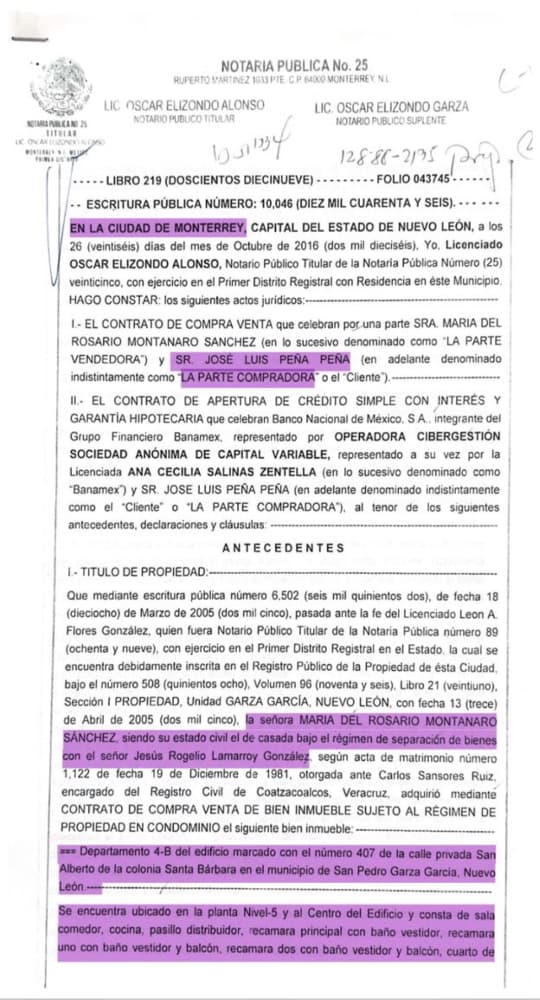 De acuerdo con la escritura, el departamento lo vendió la esposa de Lemarroy, María del Rosario Montanaro Sánchez, al esposo de Rocío Nahle, José Luis Peña Peña, en una décima parte de su valor comercial, el 26 de octubre de 2016.