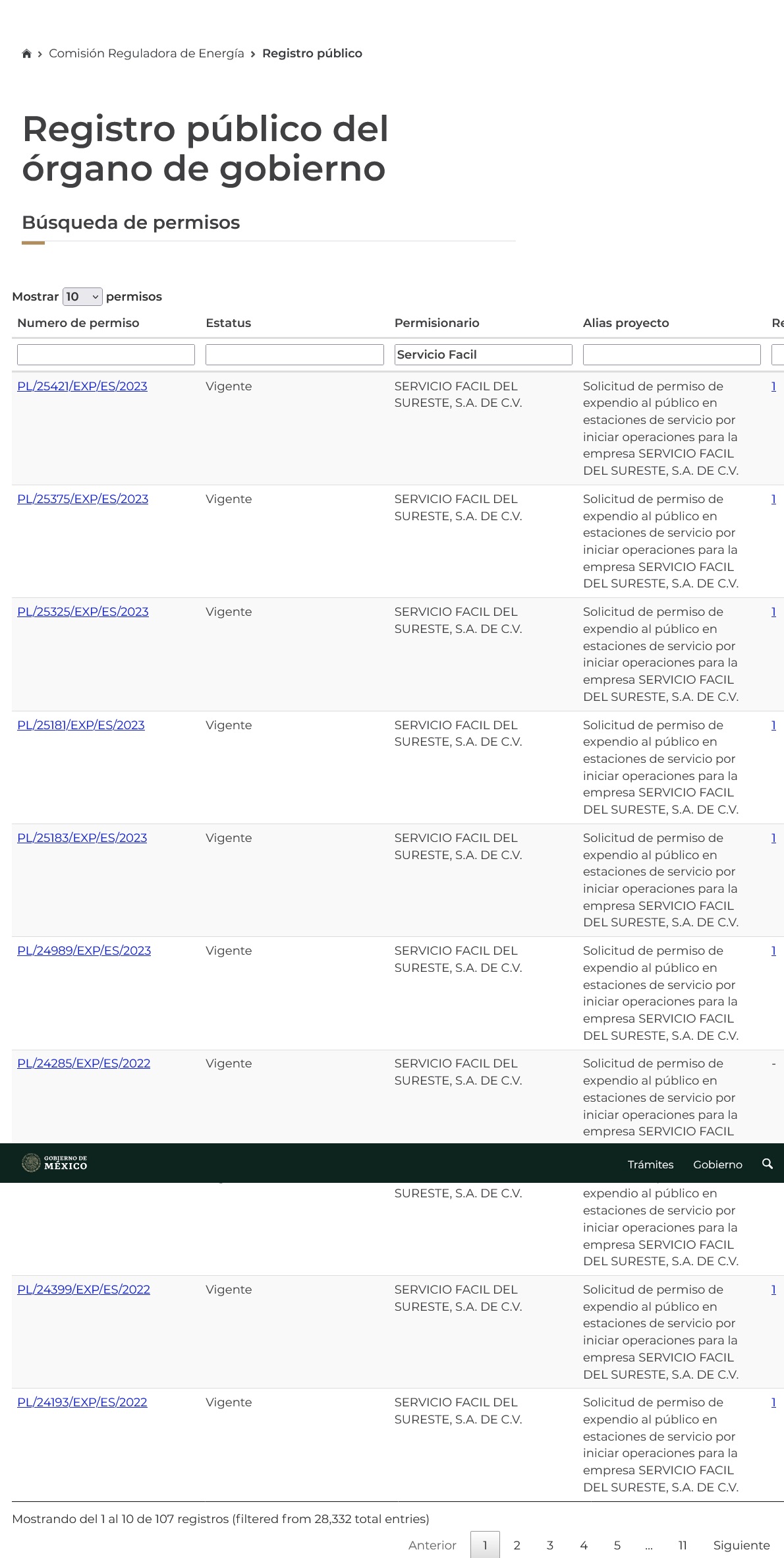 Pero en el registro que tiene el gobierno federal de este tipo de negocios, hasta finales de 2023, Servicio Fácil del Sureste S.A. de C.V. (que es la denominación fiscal de Servifacil) tenía 107 permisos para operar gasolineras, emitidos a partir de 2015, cuando empieza el registro.