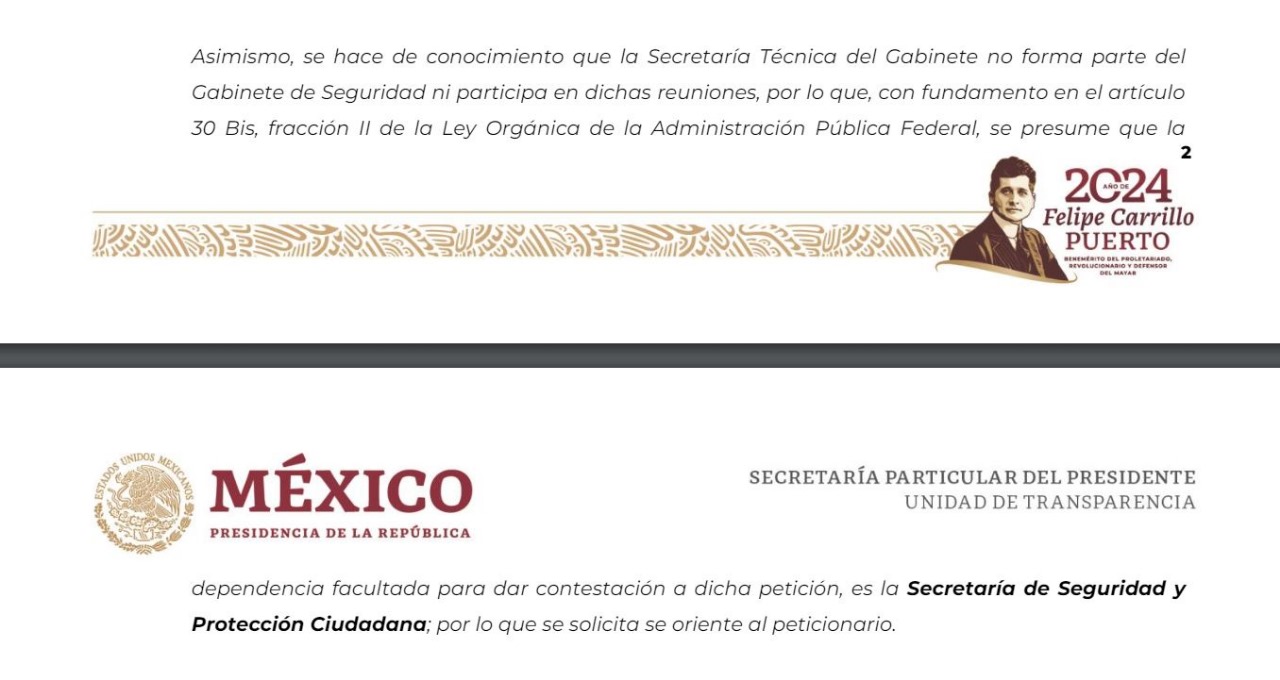 En la Presidencia de la República, derivaron la solicitud hacia la “Secretaría Técnica del Gabinete”, la cual apuntó que “no forma parte del Gabinete de Seguridad ni participa en dichas reuniones”, por lo que, dijeron, no tienen las minutas de las reuniones y orientaron hacia la Secretaría de Seguridad y Protección Ciudadana para que respondiera.