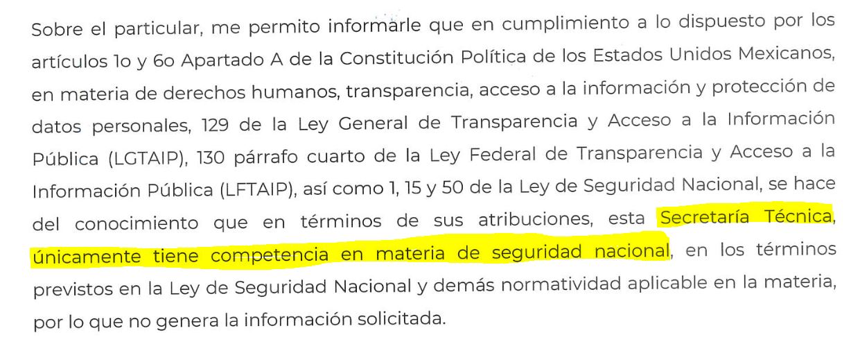 La Secretaría de Seguridad y Protección Ciudadana, que fue la mencionada como la que podría tener la información, por su parte respondió vía el Secretario Técnico del Consejo Nacional de Seguridad Nacional, Félix Arturo Arce Vargas, que “esta Secretaría Técnica, únicamente tiene competencia en materia de seguridad nacional”.