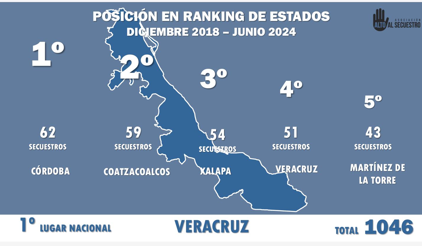 Veracruz sigue siendo el estado con mayor número de casos de secuestro acumulados en el actual sexenio, de acuerdo con las mediciones de Alto Al Secuestro, con 1 mil 46 casos.