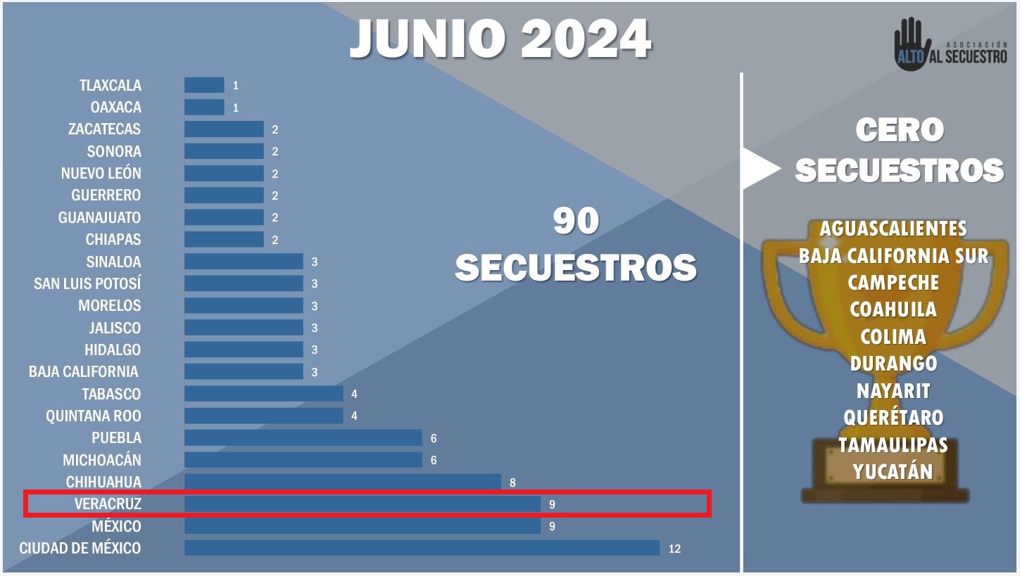 La organización Alto al Secuestro, en cambio, en el seguimiento que hace de la ocurrencia de este tipo de delitos enumeró 9 casos, lo que puso a Veracruz en el país como el estado con el segundo mayor número de casos de este tipo, junto con el estado de México y después de la Ciudad de México, en la que se rastrearon 12 incidencias de este tipo.