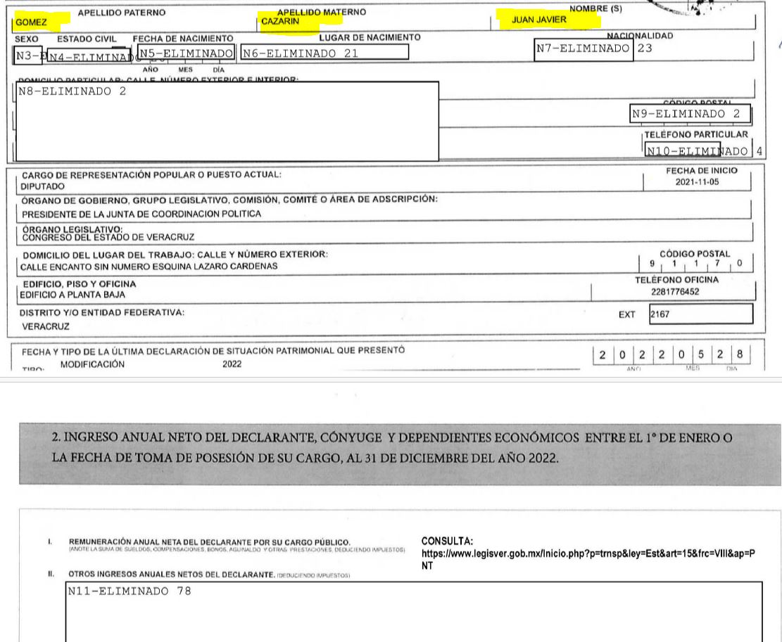 Pero conocer cuáles son los bienes que tiene Gómez Cazarin, o por lo menos los que declara tener, no es posible, porque su declaración patrimonial está censurada.