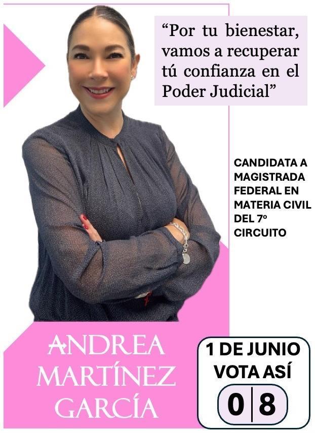 *** ¡Fíjese bien en los perfiles! Si vives en Boca del Río, Veracruz, Orizaba, Córdoba, Alvarado, San Andrés, Huatusco, Zongolica y la región, es importante que conozcas las propuestas de la abogada *Andrea Martínez García*, candidata a Magistrada por el Distrito 2 en materia Civil del Séptimo Circuito…y aparece en la respectiva boleta con el número 08… “Recuperar la confianza en el Poder Judicial”... El de Andrea Martínez es un perfil fresco y joven a pesar de tener más de 25 años de experiencia en el Poder Judicial… Olvídese de los candidatos de Tómbola… si tenemos gente preparada de verdad…