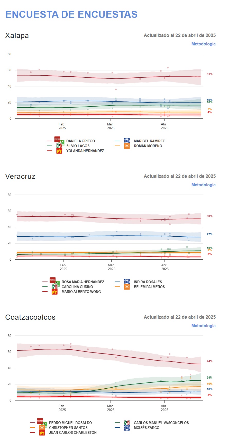 A menos de dos meses de las elecciones municipales del 1 de junio de 2025 en Veracruz, las encuestas reflejan una clara ventaja de Morena en la mayoría de los 212 municipios. Según la Statistical Research Corporation, Morena lidera con un 41.6% de las preferencias, seguido por el PAN con un 22.9% y el PRI con un 6.7%. Por su parte, la encuesta de Arias Consultores muestra que Morena se posiciona como favorito en municipios como Coatzacoalcos, Martínez de la Torre, Minatitlán, Veracruz y Xalapa.
