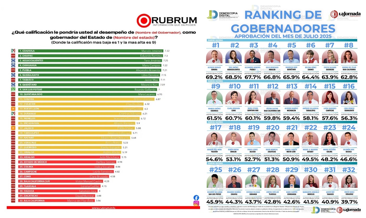 El contraste lo aporta la casa encuestadora Rubrum, que hace unos días publicó también una evaluación sobre mandatarios estatales. https://rubrum.info/evaluacion-ciudadana-a-gobernadores-septiembre-2025/