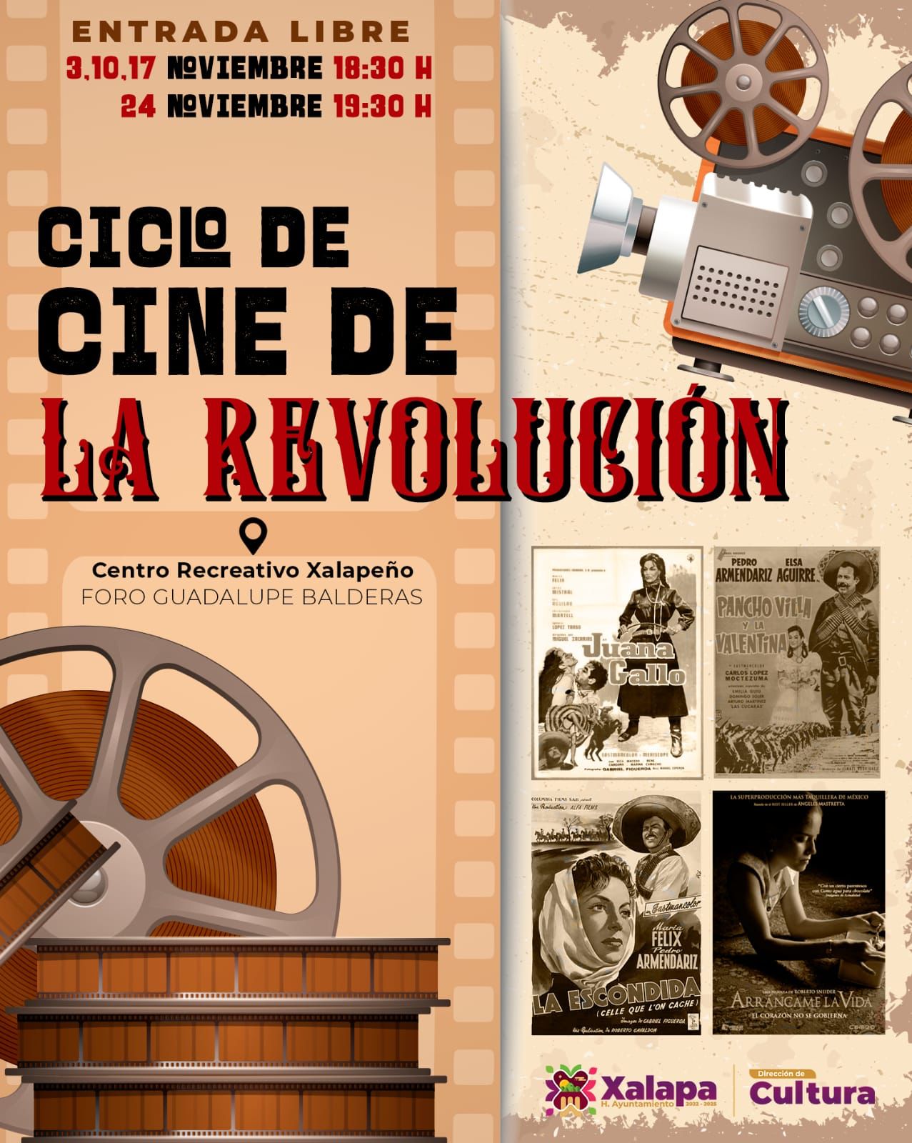 Xalapa, Veracruz, noviembre 7.- El Ayuntamiento de Xalapa, a través de la Dirección Municipal de Cultura, sigue apostándole al realce de la música y al desarrollo artístico y cultural de los capitalinos sin importar sus edades, por eso preparó para esta semana una extraordinaria cartelera que incluye el ciclo de cine “La Revolución”, con proyecciones todos los jueves de noviembre a las 18:30 horas, en el foro “Guadalupe Balderas” del Centro Recreativo Xalapeño.