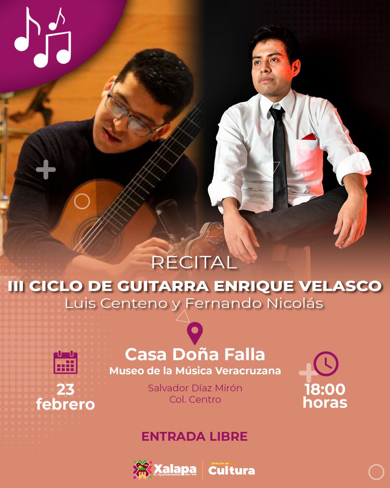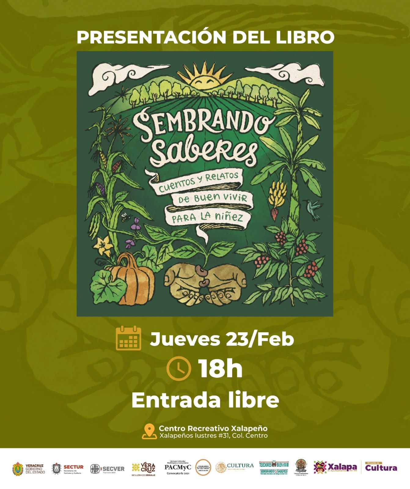 Para el jueves 23 de febrero a las 9:00 horas está previsto el Segundo Concierto Didáctico de la Orquesta Pauta Nueva en la Escuela Primaria “Benito Juárez García”; y a las 18:00 horas en el Centro Recreativo Xalapeño, está pautada la presentación del libro “Sembrando Saberes, cuentos y relatos de buen vivir para la niñez”.