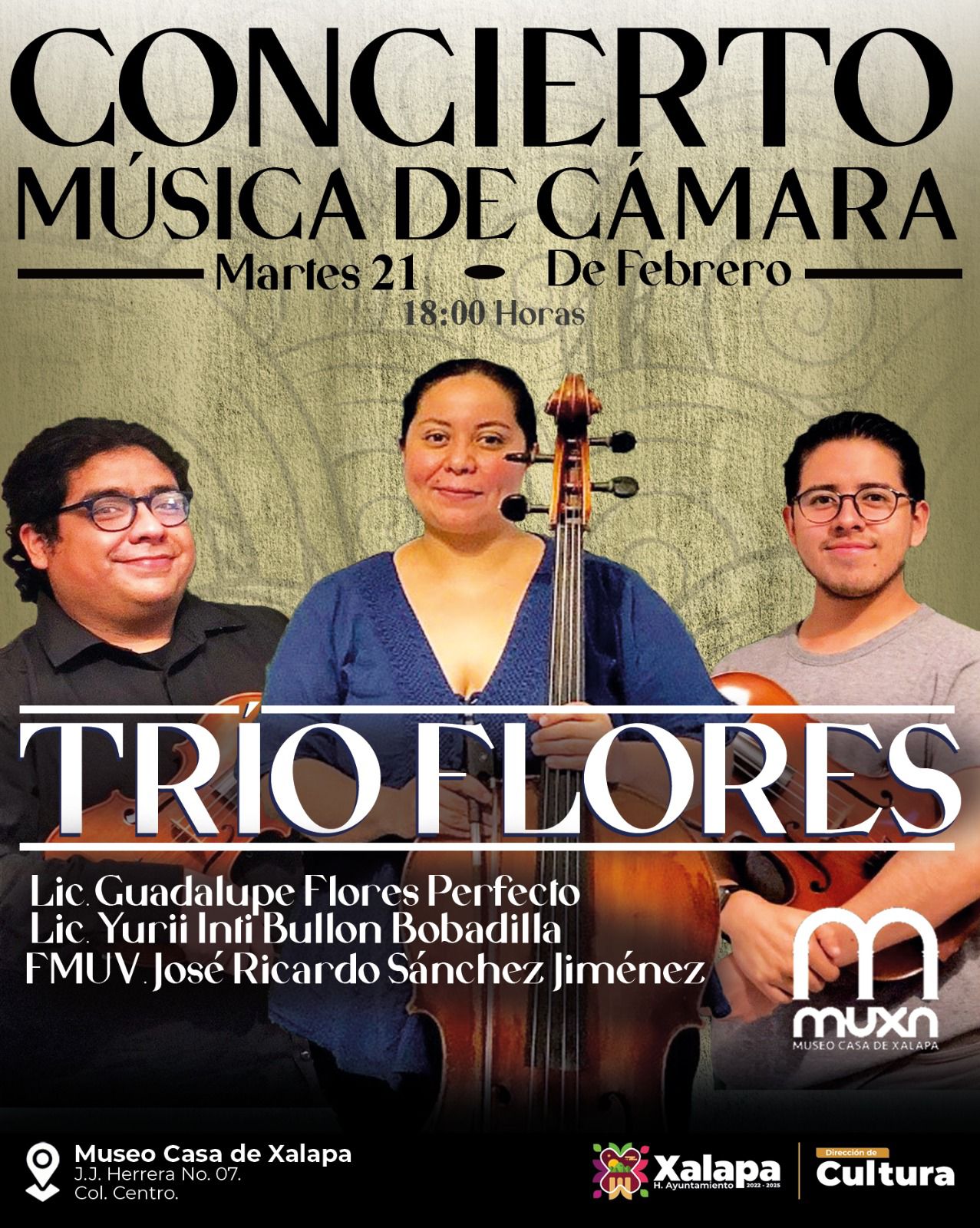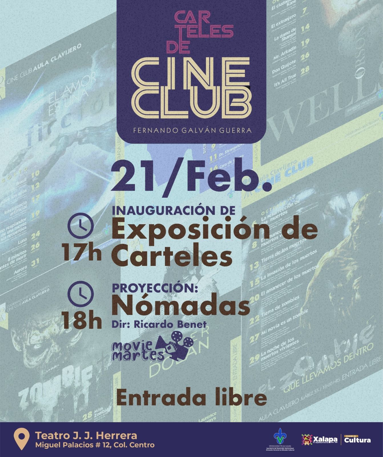 El martes 21 a las 17:00 horas, Fernando Galván Guerra inaugurará la Exposición de Carteles de Cine Club en el Teatro JJ Herrera y a las 18:00 horas, se proyectará la película “Nómadas” de Ricardo Benet; y a esa misma hora, el Trío Flores conformado por Guadalupe Flores Perfecto, Yurii Inti Bullon Bobadilla y José Ricardo Sánchez Jiménez ofrecerán un concierto en el Museo Casa de Xalapa.