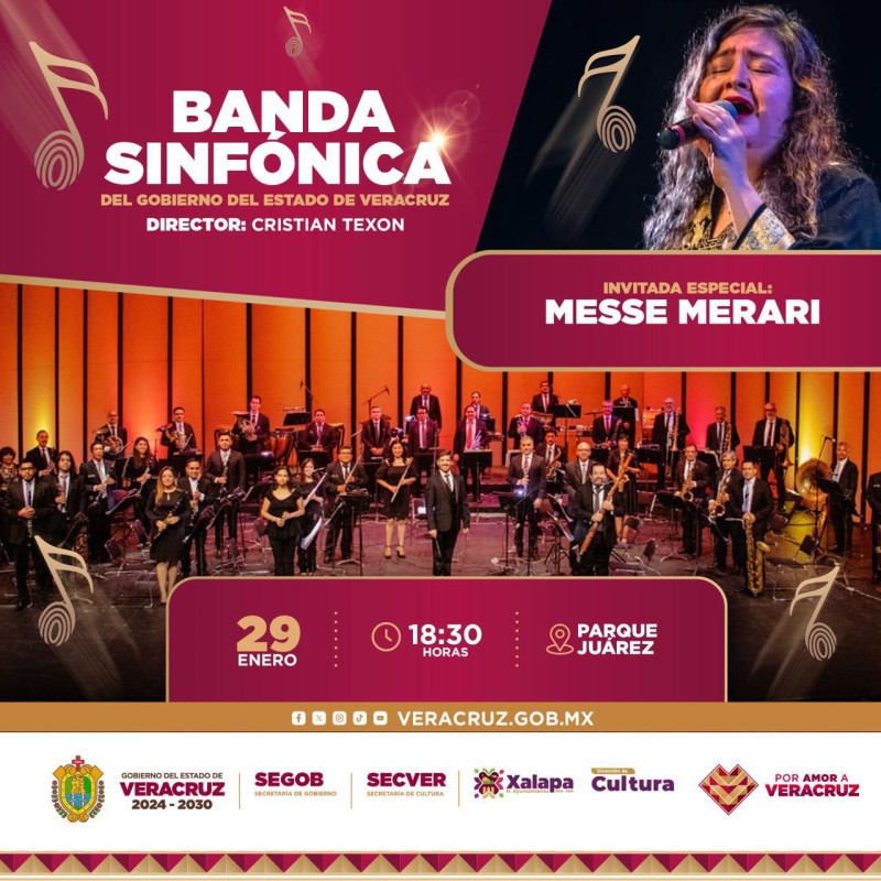 Xalapa, Veracruz, 23 enero 2024.- En el marco de los 139 años de su fundación, la Banda Sinfónica del Gobierno del Estado de Veracruz, bajo la dirección de Cristian Texon, ofrecerá un concierto gratuito en el parque Benito Juárez el próximo 29 de enero a las 18:30 horas.