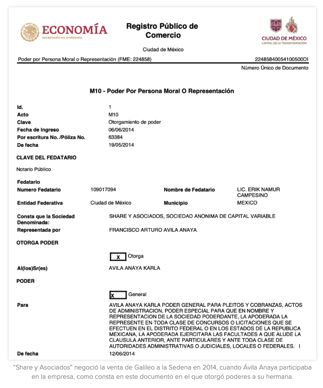 En 2014, cuando se empezó a negociar la venta de Galileo a la Sedena, Ávila Anaya seguía participando en la empresa, según consta en documentos notariales. Por ejemplo, el 19 de mayo de ese año otorgó a su hermana Karla un poder general para pleitos, cobranzas y actos de administración, además de darle facultades para representar a la empresa en contratos y licitaciones públicas.